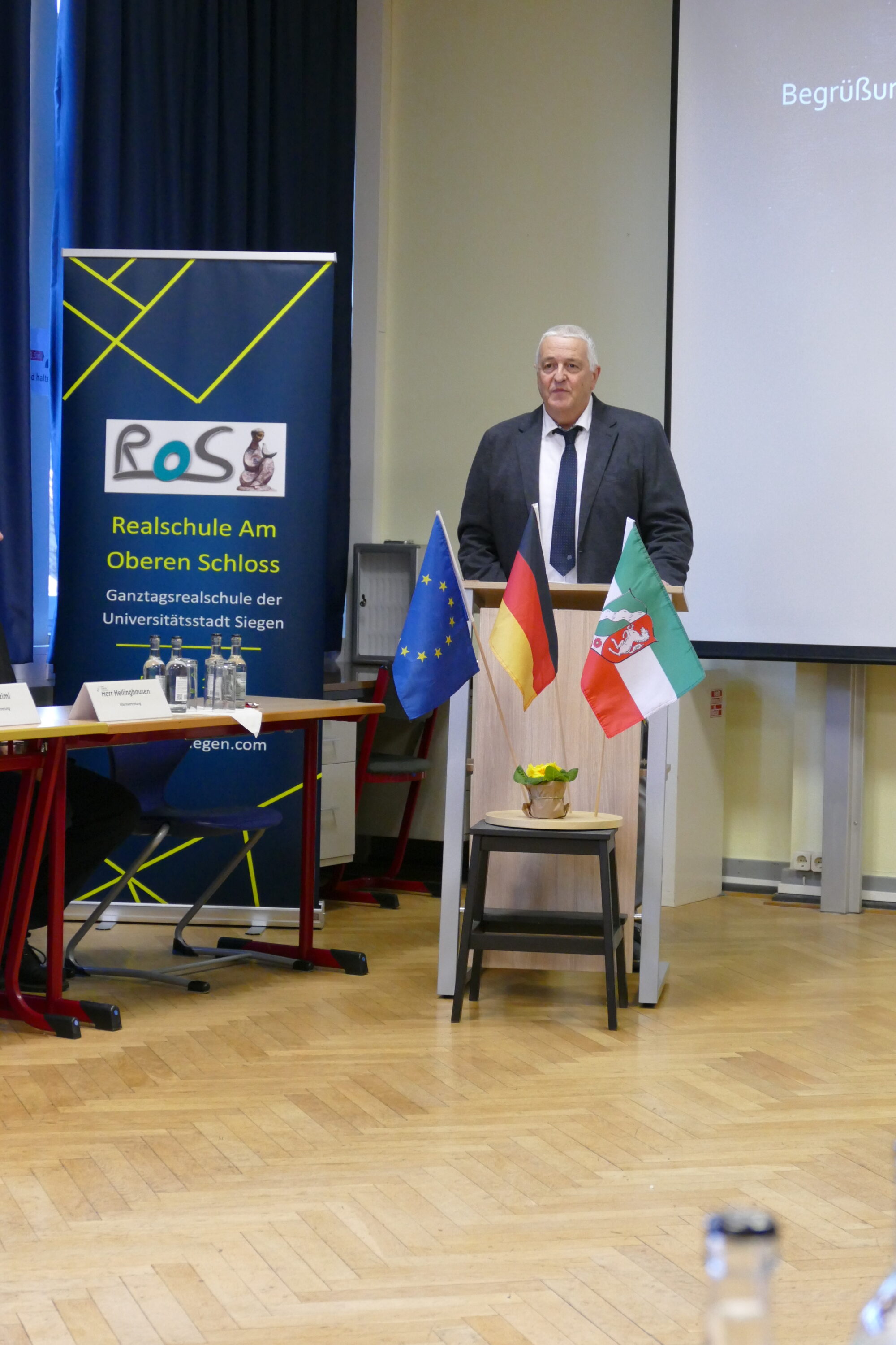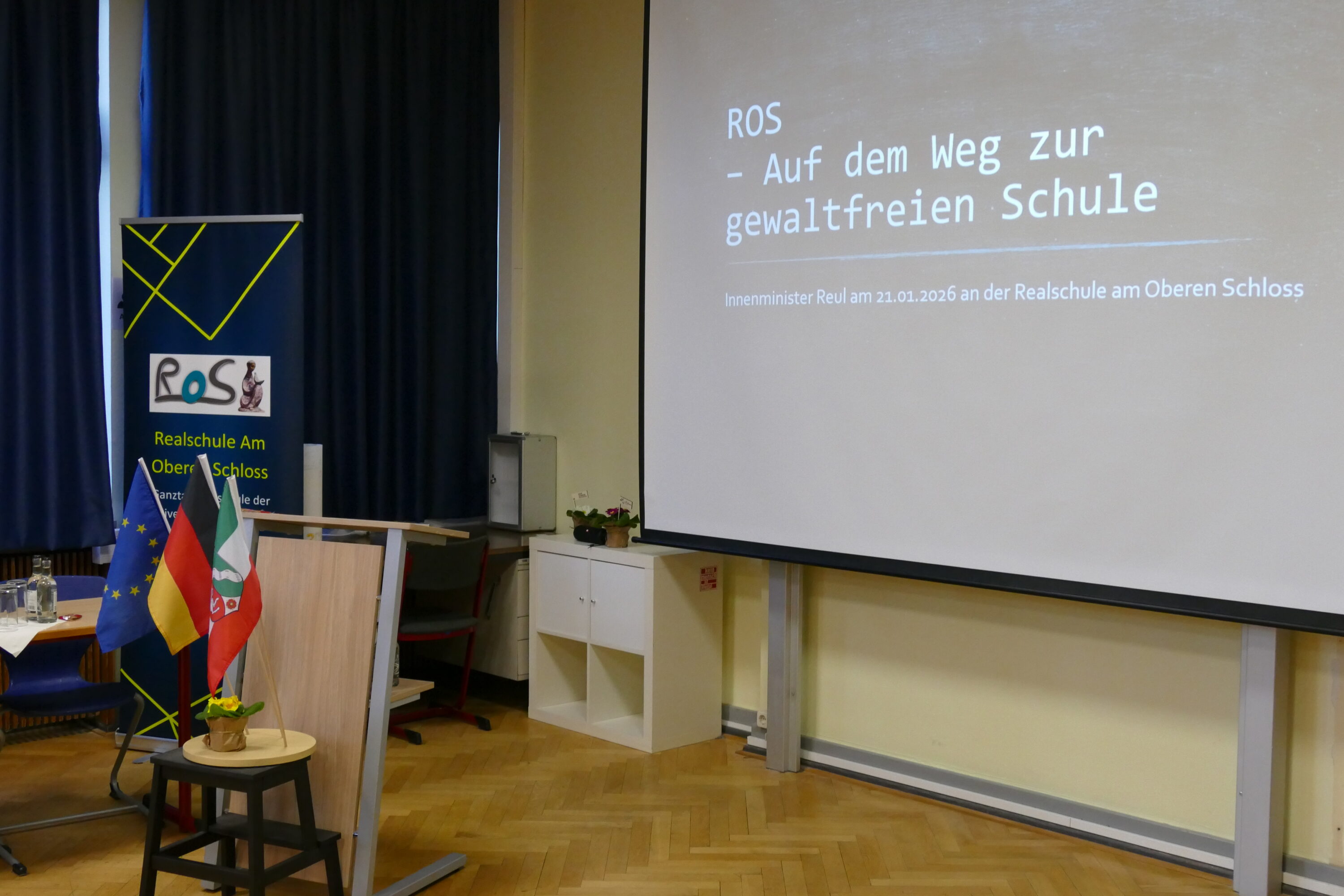 Die Schulgemeinschaft bereitete dem Minister einen vielfältigen und würdigen Empfang. Auf dem Schulhof wurden Fahnen verschiedener Länder gezeigt, die die Herkunft der Schülerinnen und Schüler widerspiegeln. Die ROS ist eine Schule mit großer kultureller Vielfalt: Rund 460 Schülerinnen und Schüler aus 43 Nationen lernen hier zusammen, viele von ihnen haben einen Migrationshintergrund. Die Schulleitung betonte, dass diese Vielfalt eine große Chance, aber auch eine Herausforderung darstellt.